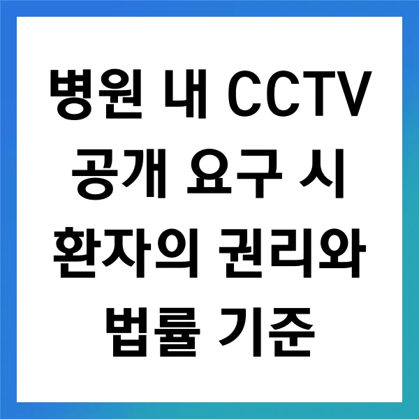 이 글을 통해 병원 내 CCTV 공개 요구 상황 에서 환자가 가질 수 있는 권리 와 법적 기준에 대해 알아보았습니다. CCTV 영상은 사생활과 개인정보 보호라는 중요한 윤리적, 법적 요소와 맞물려 있습니다. 환자는 자신의 권리와 관련 법 규정에 대해 충분히 이해하고 , 필요시 법적 절차를 통해 권익을 보호할 수 있어야 합니다. 적법한 절차를 통해 공정하게 접근하는 것이 필요합니다. 이 모든 과정을 통해 환자와 병원 모두가 신뢰할 수 있는 환경이 조성되기를 기대합니다.