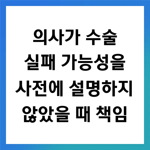의료진의 법적 책임 은 의료 사고 발생 시 환자에게 미치는 영향을 심각하게 고려 해야 합니다. 의료진은 환자에게 적절한 치료 및 서비스를 제공할 법적 및 윤리적 책임 을 지고 있습니다. 특히, 수술 실패에 대한 충분한 설명 없이 이루어진 의료 행위는 그 자체로 법적 책임의 문제가 될 수 있습니다.